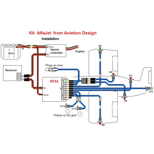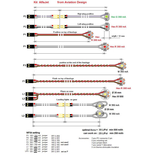 Kit obsahuje jednotku NF54, tři červené, jednu zelenou a jednu bílou LED 350 mA pro poziční světla, dvě bílé LED 350 mA a jednu 600 mA pro přistávací světla a jednu červenou LED 350 mA pro zábleskové světlo. Všechny LED jsou vybaveny kabeláží a konektory v rozměrech modelu letadla AlfaJet.