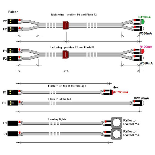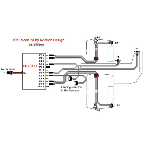Kit obsahuje jednotku NF-3XL, jednu červenou, jednu zelenou a dvě bílé LED 120 mA pro poziční světla, dvě bílé a jednu červenou LED 700 mA pro záblesková světla, dvě bílé LED 350 mA pro přistávací reflektory. Všechny LED jsou vybaveny kabeláží a konektory v rozměrech modelu Falcon 7X v měřítku 1:7