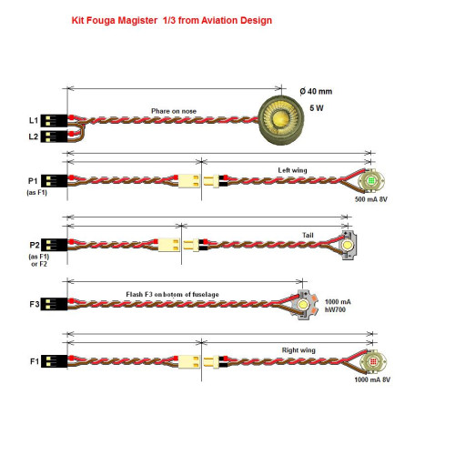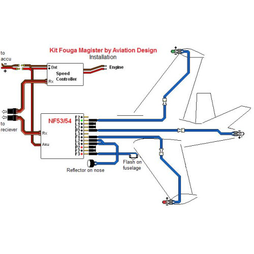 Kit obsahuje jednotku NF54, jednu červenou a jednu bílu LED 1000 mA a jednu zelenou LED 500 mA pro záblesková světla, dvě bílé LED 700 mA pro poziční světla a jeden bílý reflektor 5W pro přístávací světlo. Všechny LED jsou vybaveny kabeláží a konektory v rozměrech modelu Fouga Magister v měřítku 1:3.