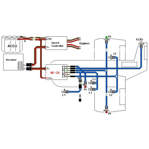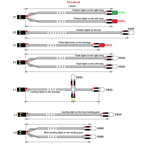 Der Kit enthält die Einheit NF-3X, eine rote, eine grüne und eine weiße LED 20 mA für Positionsleuchten, zwei weiße und eine rote LED 20 mA für Blitzleuchten und drei weiße LEDs 80 mA für Landeleuchten. Alle LEDs sind mit einer Verkabelung und Verbindungsstecker in Ausmaße von Flugzeugmodell LearJet 45 ausgestattet.