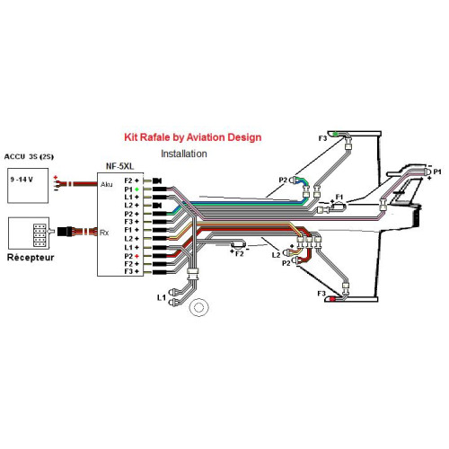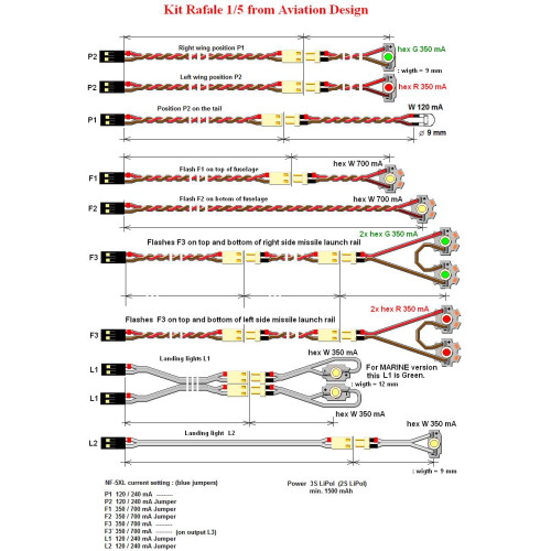 Kit obsahuje jednotku NF-5XL, dvě červené a dvě zelené LED 350 mA a dvě bílé 700 mA pro záblesková světla jednu zelenou, jednu červenou LED 350 mA a jednu bílou LED 120 mA pro poziční světla a tři bílé LED 350 mA pro přistávací světla. Všechny LED jsou vybaveny kabeláží a konektory v rozměrech modelu Rafale v měřítku 1:5.