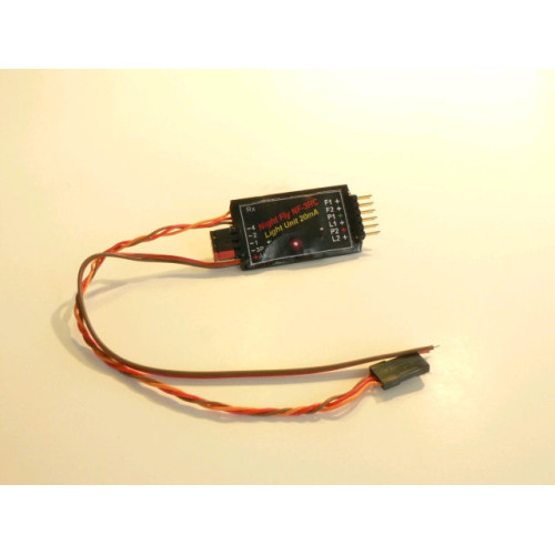 Je-li jednotka řízena z přijímače, tak rychlým blikáním přistávacích a antikolizních světel indikuje výpadek signálu přijímače. Připojení k přijímači je pomocí konektoru typu Graupner, Hitec. Obvod přijímače je galvanicky oddělen od obvodů světel optočlenem.