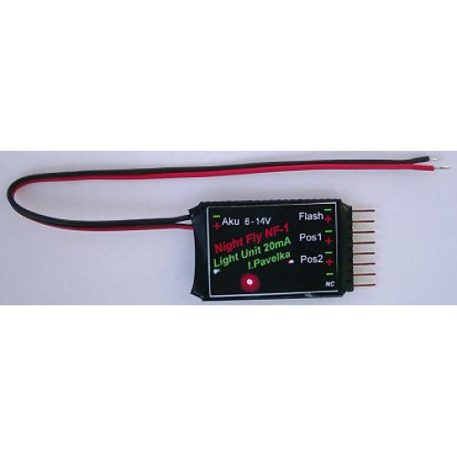 NF-1 je jednotka pro osvětlení samokřídel, SlowFly a ParkFly modelů pro létání v noci. Slouží k napájení barevných vysoce-svítivých LED (Light-Emitting Diode) s jmenovitým proudem 20mA.. Obsahuje tři nezávislé proudově napájené výstupy pro připojení diod. Dva výstupy jsou trvale svítící a slouží pro napájení pozičních světel (Pos1, Pos2). Třetí výstup (Flash) bliká se sekundovou frekvencí a je určen pro napájení anti-kolizních světel.