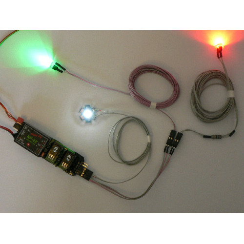 Obvod zábleskových světel bliká se sekundovou frekvencí. Propojkou je možné nastavit počet za sebou jdoucích záblesků. Rozpojeno = 1 záblesk, propojka na "2x" = 2 záblesky, propojka na "3x" = 3 záblesky. Propojkou "3p" se volí režim ovládání světel. Rozpojená propojka nastaví režim dvou-polohového ovládání (FLY, LAND). V tomto režimu poziční a záblesková světla svítí trvale a přistávací světla jsou ovládána z vysílače. V třípolohovém režimu (OFF, FLY, LAND) je standardní rozsah výchylky serva rozdělen na tři oblasti, v první poloze jsou všechna světla vypnuta, v druhé se rozsvítí poziční a záblesková světla, ve třetí se přidají přistávací světla. Bez zapojeného konektoru přijímače pracuje jednotka jako neřízená. Pak jsou poziční a záblesková světla zapnuta trvale a propojka "3p" slouží k ručnímu ovládání přistávacích světel. Ta budou v režimu "2p" zapnutá a v režimu "3p" vypnutá.
