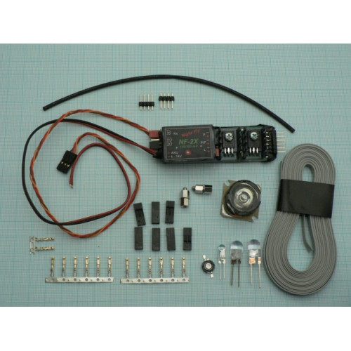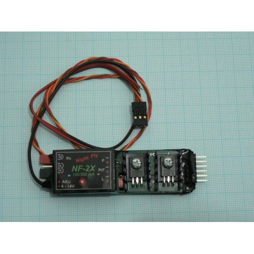 NF-2X je jednotka pro osvětlení modelů a maket s rozpětím nad 1,7m a pro létání v noci. Slouží k napájení barevných vysoce-svítivých LED (Light-Emitting Diode). Obsahuje tři proudově napájené výstupní okruhy. Výstup označený P je určen pro diody s jmenovitým proudem 20 mA a slouží pro napájení pomocných pozičních světel a nebo pro osvětlení kabiny či osvětlení palubní desky. Druhý výstup P/F slouží buď pro napájení pozičních a nebo zábleskových světel proudem 120 nebo 350 mA ( volba se prování propojkami na desce ( viz. následující obrázek). Třetí výstup L je určen pro napájení přistávacích světel 350 mA ( případně 120 mA - na objednání).