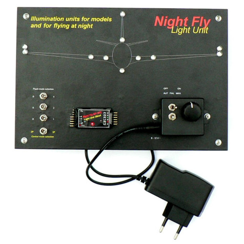 Demoboard obsahuje řídicí jednotku NF-3RC, simulátor přijímače, napájecí zdroj a siluetu makety letadla osazenou pozicičními, zábleskovými a přistávacímí LED 20 mA, které demonstrují reálné osvětlení modelů letadel. Pomocí desky lze předvést ovládání jednotky z vysílače prostřednictvím otočného knoflíku. Na desce jsou umístěny 4 přepínače pro volbu režimu záblesků, pro ukázku řízení světel pomocí jedno nebo doupolohového přepínače. Tyto přepínače nahrazují zapojení jumperů u reálných řídicích jednotek.